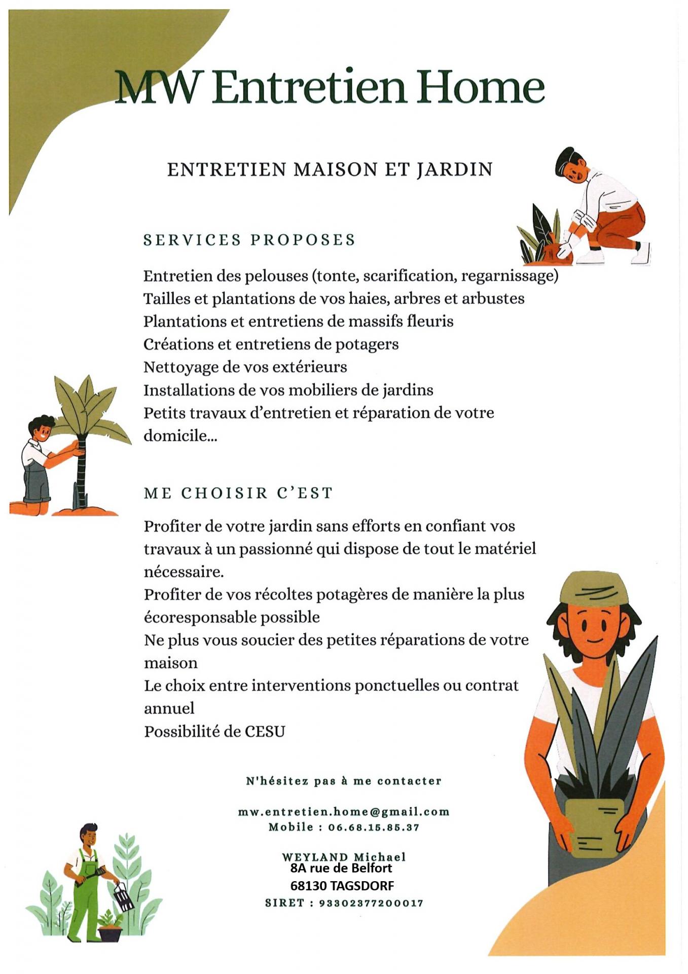 ENTRETIEN MAISON ET JARDIN Entretien des pelouses, tailles et plantation de haies, massifs, potagers... Petits travaux d'entretien et réparation WEYLAND Michael 06.68.15.85.37 mw.entretien.home@gmail.com |